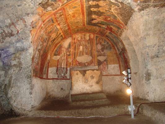 À Melfi dans l'église rupstre de Santa Margherita se retrouve dans l'une des quatre chapelles une représentation de la rencontre des trois vifs et des trois morts qui est considérée comme la plus ancienne d'Italie. Certains avancent même qu'il s'agit de la première peinture murale qui abordant ce thème à travers toute l'Europe. Une thèse contreversée car d'autres sources voient une origine française avec les œuvres présentes au Mont St-Michel et à Avignon. Une chose est certaine, il s'agit d'un modèle en apparence primitif. Il n'y a pas de décor qui accompagne les personnages (pas de chevaux, de chiens, de tombes, de calvaire ou d'ermite). Les vivants sont richement habillés et montrent une attitude passablement stoïque. On remarque aussi qu'ils sont présentés à trois âges bien différents. Le premier, le plus agé, porte un faucon et tend sa main vers les morts. Le second personnage dans un geste protecteur pose ses mains sur le troisième qui semble le plus jeune du trio. On ne compte maintenant que deux morts, il est fort possible que le troisième ait disparu suite à la dégradation du crépis. Les squelettes ont une attitude statique, ils ne possèdent aucune arme et ne sont pas recouverts par un linceul. Un documentaire (en italien) sur cette église est disponible sur le site de YouTube.