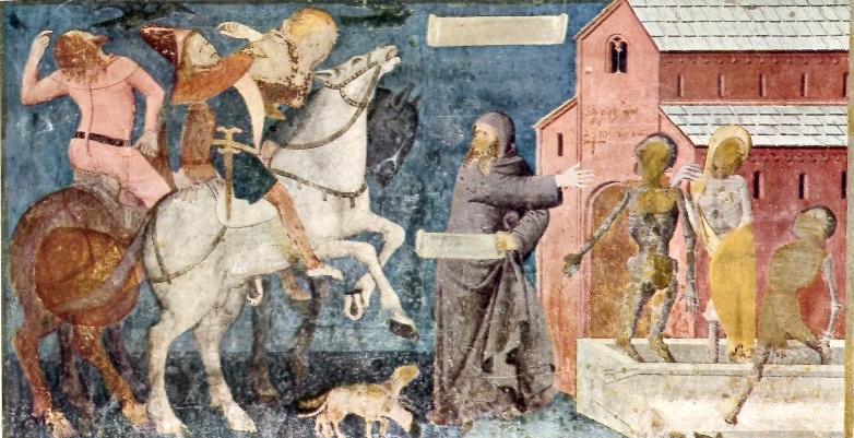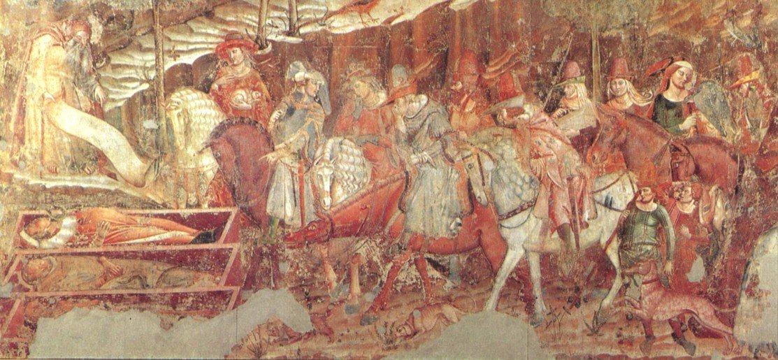 Au Campo Santo de Pise, le thème macabre de cette section fait partie d'un ensemble monumental où l'on retrouve aussi: Un Triomphe de la Mort, une Vie des Pères du Désert et aussi un combat entre anges et démons pour les âmes des morts. Malgré quelques fragments manquants à cause un incendie survenu en 1944, cette rencontre des trois vifs et des trois morts est toujours en bon état. Les spécialistes attribuent à Francesco Traini ou à Buonamico Buffalmacco la création de cette œuvre vers 1365. Le fait plus étonnant est que l'on ne décompte pas trois vifs, mais une cavalcade de vifs (dix chevaliers, dont quatre femmes plus deux écuyers qui sont à pied). Trois des personnes du groupe se situent près des cadavres et semblent discuter entre elles. Un premier pointe du doigt les morts et adresse la parole aux deux autres: une femme accablée qui incline la tête sur son épaule droite et un homme qui écoeuré par l'odeur se bouche le nez. Un autre cavalier, faucon au poing, s'approche en se haussant sur ses étriers, afin de mieux voir la scène. Cette cavalcade se compose aussi d'un chevalier barbu, d'une femme tenant un petit chien, d'une autre portant un coffret à bijoux et d'une troisième dont on ne perçoit que la tête. Deux chevaliers dont un tenant un faucon discute entre eux et ferme le groupe. Aucun des douzes personnages semblent porter attention à l'ermite qui tient un phylactère dans une main et qui de l'autre pointe son message. Les cadavres à divers stades de décomposition: corps boursouflé, décharnés et squelettiques (voir photos sur la droite) sont couchés dans leurs cercueils. Le paradoxe entre les corps pourris et la splendeur de ce groupe de nobles est frappant. Pour voir cette peinture murale dans son intégralité, cliquez ici.