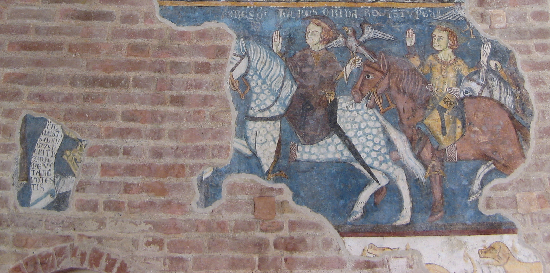 Ce n'est pas une, mais deux peintures sur ce thème que l'on peut apercevoir à l'église Santa Maria de Vezzolano située dans le Piémont. De la première datant du début du 14e siècle (image à gauche), il ne subsiste que deux des trois vifs qui montent à cheval. Ils manifestent leurs craintes par de graves mouvements de leurs bras. Les animaux sont aussi effrayés par la rencontre. On voit les faucons s'envoler et un cheval montrer les dents.