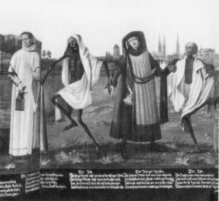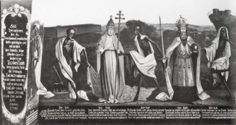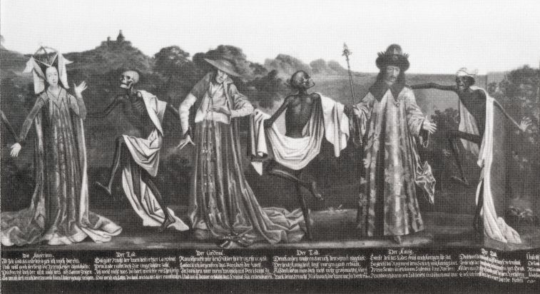 La danse débute avec un Mort coiffé d'un chapeau et jouant de la flûte. Puis un Mort portant un cercueil entraîne le pape dans la danse en tirant sur sa toge. D'autres personnages suivent: l'empereur, l'impératrice, le cardinal, le roi, l'évêque, le duc (détruit en 1799), l'abbé, le chevalier, le chartreux, le maire, le