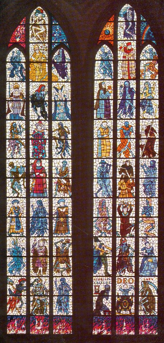 Pour remplacer la perte de la danse macabre, l'un des joyaux de la ville, Alfred Mahlau a créé en 1955-56 deux vitraux sur le même thème qu'on peut admirer dans le transept nord de l'église. Le premier vitrail présente un Mort joueur de flûte; la danse débute avec le pape suivi de l'empereur, l'impératrice, le roi, le maire, le marchand, le fonctionnaire, le noble et le chevalier. Le second vitrail commence avec un Mort portant un cercueil, suivi par le médecin, l'usurier, le chartreux, l'ermite, le paysan, le sacristain, le jeune homme, la jeune fille et finalement l'enfant dans son berceau. La partie inférieure de chacun des vitraux montrent la ville de Lübeck en flamme. On retrouve seulement 18 personnages (le cardinal, l'évêque, le duc, l'abbé, le chapelain et le chanoine ont été omis). Deux scènes sont particulièrement touchantes dans cette oeuvre. Alors qu'un Mort tire le bébé hors de son berceau, un autre, à genoux, s'enfouit le visage dans ses mains. Dans la scène précédente la Mort, qui veut entraîner la jeune fille, est retenu par le jeune homme qui tient son bras. Admirez les vitraux dans leur intégralité en cliquant ici (attention: fichier volumineux, mais remarquable)