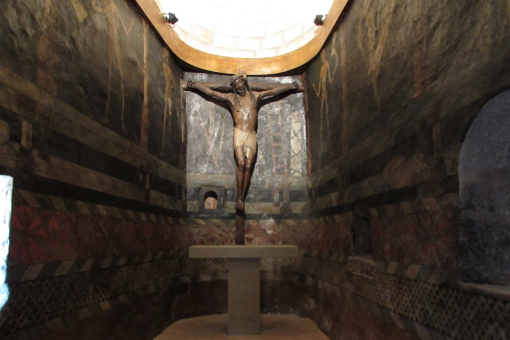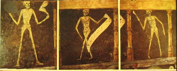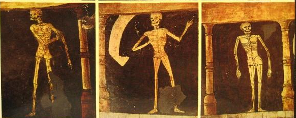 Le visiteur qui pénètre dans la petite chapelle Saint-Christ du château de Javier, en Navarre, voit d'abord devant lui un crucifix. Connu sous le nom de Christ souriant. Derrière celui-ci sont peints des instruments de la Passion : le marteau, un clou, une échelle, la lance du centurion et l'éponge imbibée de vinaigre piquée au bout d'une branche. Sur les autres murs s'étale une danse des morts composée de huit squelettes gesticulants : trois sur le côté gauche, trois sur le côté droit, tous sont séparés par des colonnes peintes. Deux autres squelettes, présentant chacun une banderole, surplombent la porte d'entrée. ![]() La peinture murale qui décore cette chapelle date du début du 15e siècle. Elle a été découverte et restaurée en 1971. Les squelettes de couleur ocre sont peints sur un fond noir. Ils n'accompagnent aucun vivant et ne portent ni linceul ni arme. Certains présentent toutefois des phylactères où sont inscrits des textes aujourd'hui indéchiffrables. Références Franco Mata, Angela. Encuentro de los tres vivos los res muertos y las Danzas de la muerte. Museo Arqueológico Nacional. 2002