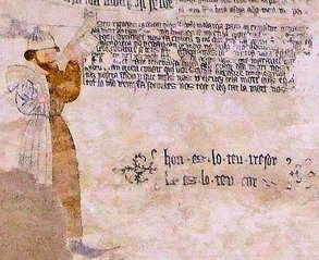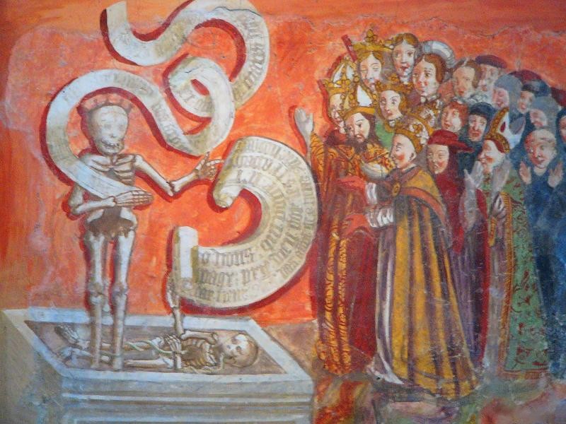 Au couvent Saint-François, à Morella, se trouve une peinture murale inusitée abordant plusieurs thématiques. Elle présente ainsi : la Mort sous la forme d'un archer qui tire des flèches sur l'arbre de la vie, une hypothétique roue de la Fortune ainsi qu'une danse macabre non classique. En effet, la Mort n'accompagne aucun des personnages représentés. Elle figure plutôt une seule fois sous les traits d'un cadavre éviscéré couché dans un cercueil. Dans la tombe gît un phylactère sur lequel il est écrit "fui quot [sic] estis, eritis quod sum". Cette sentence, "Tel je fus tu es, tel je suis tu seras", rappelle celle qu'adressent les trois morts aux trois vivants dans la légende de même nom. Par ailleurs la présence de plusieurs personnages devant un cadavre évoque une peinture murale se trouvant à l'abbaye de Saint-Michel-de-la-Cluse (Sacra di San Michele), en Italie, où les vivants forment un attroupement plutôt qu'une danse. La vingtaine de personnages qui entourent le cercueil se divise en trois groupes : les laïques (tiers gauche), les ecclésiastiques (tiers droit) et une alternance des deux dans le bas. Ces vivants sont disposés dans un ordre hiérarchique décroissant. Chez les laïques, les deux premiers sont facilement identifiables puisqu'ils sont couronnés, il s'agit du roi et de la reine. Suivent ensuite le comte, la comtesse, le duc et la duchesse. Chez les ecclésiastiques, le pape coiffé de sa tiare, le cardinal, et l'évêque précèdent deux frères tonsurés : le dominicain (en blanc), le bénédictin (en noir). La dégradation de la peinture murale empêche une identication précise des personnages suivants. La ronde reprend avec une religieuse, un laïque (?), un ecclésiastique (?), un prieur, une mère et son enfant. Sous les personnages, deux phylactères transmettent les propos des danseurs (traduction de Francese Massip et Lenke Kovàcs)1: Sous la ronde macabre, un personnage jouant de la trompette déploie une banderole arborant une série de vers. ![]() Le texte traduit est le suivant1: « Cherchant ses richesses qui nous donnent une mauvaise vie, ni pape ni empereur pour grands [...]