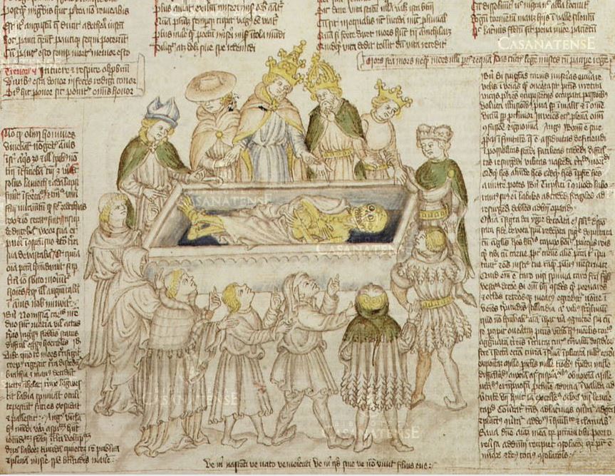 à la mort tous doivent [...] qui comme tels [?] se regardent la mort nos [...] soudainement nous fait conjuration [?] tel que [...] monture ne restaurent pas de mort ni aucun brocart […] car à tel si bien vous [...] mais la [mort?] tôt vous espère [?...] tous très généreux [?] de ceux […] m'émerveille que [...] mort hôtesse tellement ténébreuse à la pudeur de la mort [...] ont du réconfort dur qui souvent veut attendre [...] notre vie parce que nous relevez mieux de la mort qui nous espère tout le monde délivrera sauvez-nous tôt et vite parce que la mort nous [...] » Malgré qu'elle date de 1470, cette ronde macabre ne constitue pas la plus ancienne du genre. En effet, le premier exemple connu se trouve dans un manuscrit allemand intitulé Virtutum ac vitiorum delineatio, imprimé vers 1430-1440 à Heidelberg, maintenant conservé à la bibliothèque Casanatense à Rome (ms. 1404)2. Ce manuscrit pourrait avoir inspiré l'artiste du couvent de Morella puisqu'il présente également une représentation de l'arbre de la vie et une roue de la Fortune. Il contient également une représentation de la légende des trois vifs et des trois morts. La ronde macabre reviendra 160 ans plus tard dans certains pamphlets allemands et tableaux polonais. À une différence près : dans ces œuvres les squelettes alternent avec les vivants, et aucun cercueil n'occupe le centre de la ronde. Références 1 Massip, Francese et Lenke Kovàcs. La danse macabre de la cour d'Aragon : Iconographie et spectacle au Moyen Âge et ses survivances traditionnelles. Dixième congrès international sur les danses macabres. Vendôme (6-10 septembre 2000) 2 ms.1404, fol.5r, Roma, Biblioteca Casanatense. Vers 1430-1440