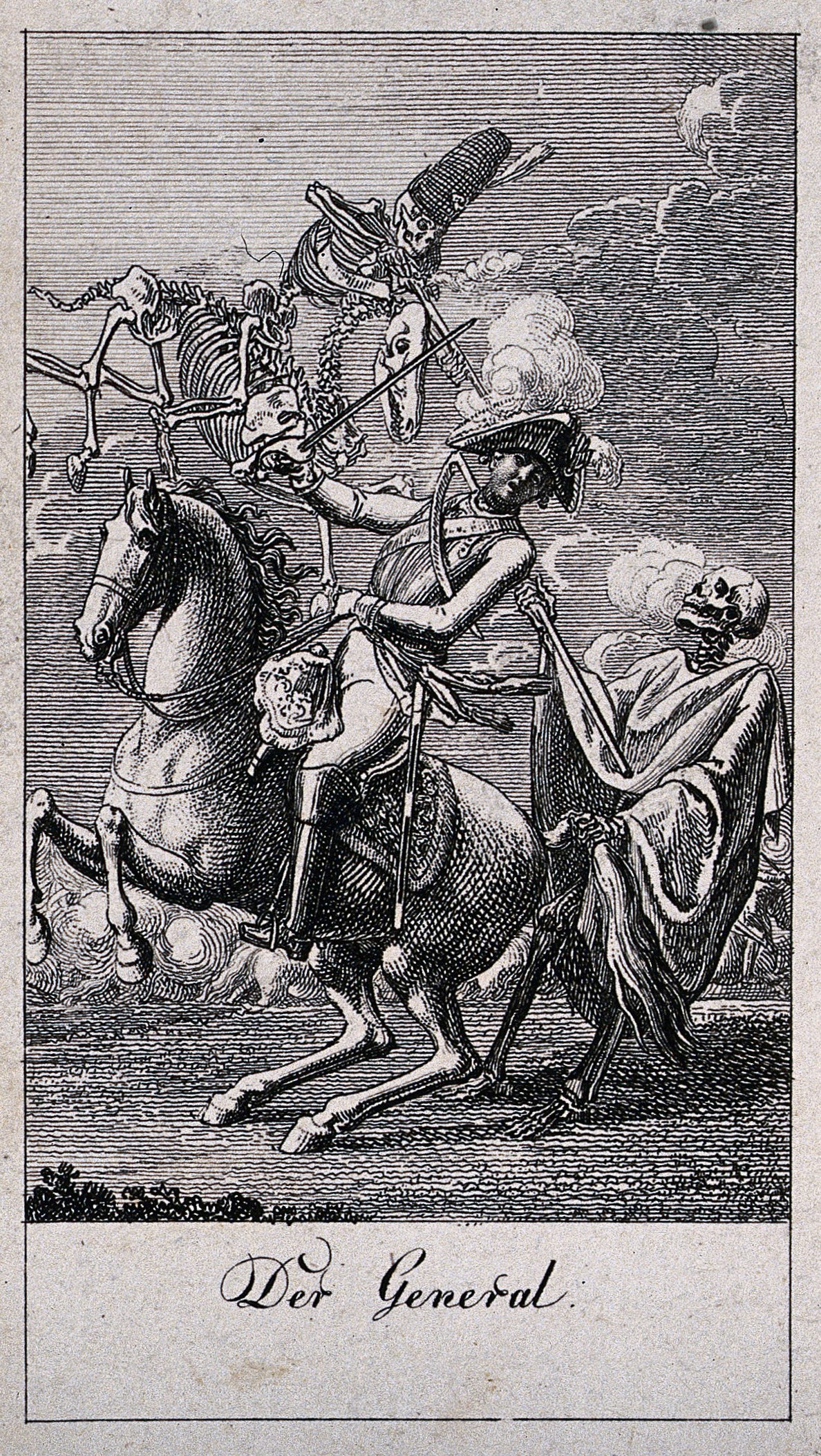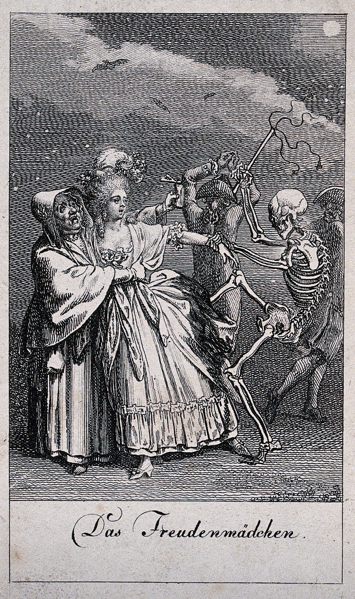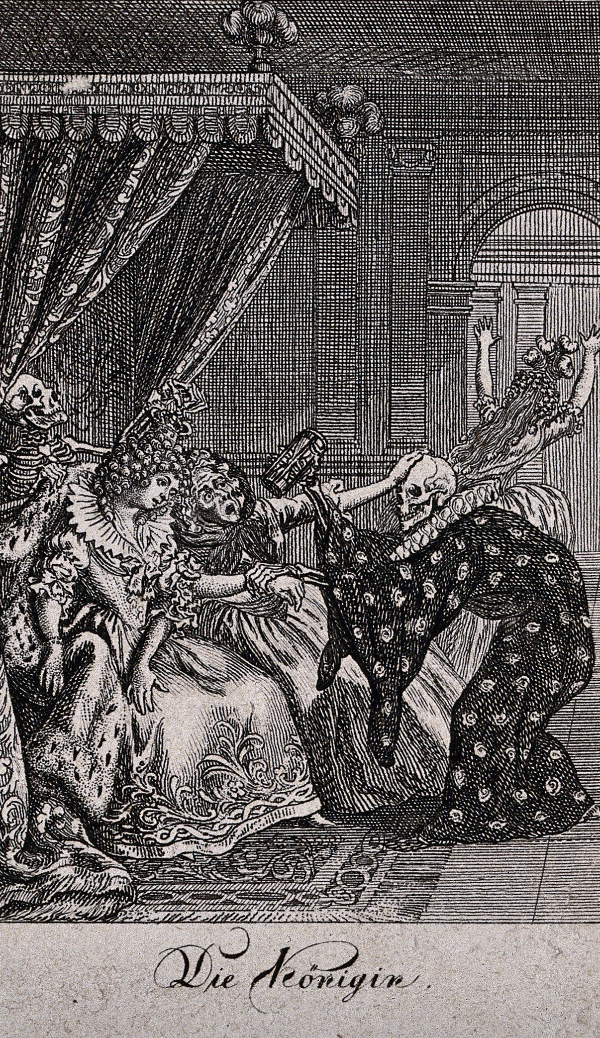 Daniel Nikolaus Chodowiecki a réalisé cette danse macabre en 1791. Il s'agit d'une série de douze gravures. Ici encore, la Mort ne danse pas la farandole, mais intervient dans le quotidien des gens. Elle n'est pas jubilatoire, mais excessivement agressive, voire violente. Elle poignarde le pape à l'aide d'une flèche, se prépare à assassiner le roi, s'apprête à transpercer la marchande de poisson avec une faux, s'attaque à une sentinelle. Même le général est traqué par deux Morts, l'une, montée sur un cheval-squelette, le fusillant, et l'autre le menaçant de sa faux. La Mort sait être cruelle; elle s'en prend à un mendiant, enlève un bébé de son berceau alors que sa nourrice s'est assoupie, agresse une mère sous les yeux de ses enfants. Chodowiecki a inclu dans sa danse macabre des scènes classiques, comme celle de la Mort créant la panique à la cour de la reine ou celle de la Mort qui s'interpose entre le médecin et son patient. Ce thème a maintes fois été repris dans des danses macabres ou dans d'autres oeuvres individuelles. L'artiste a aussi ajouté des représentants de classes sociales plutôt inusitées comme la fille de joie ou l'aristocrate se glorifiant de sa lignée. On voit bien ce dernier pointer du doigt les armoiries de sa famille pendant que la Mort se prépare à l'occire. Comme toujours, riches et pauvres se côtoient dans la mort. Références 1 Les images (à l'exception de celle du pape) proviennent de la Wellcome Collection