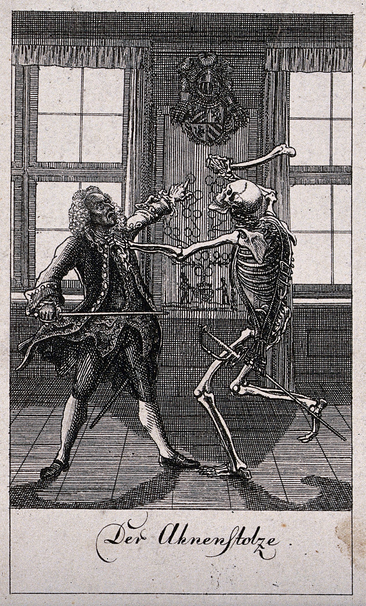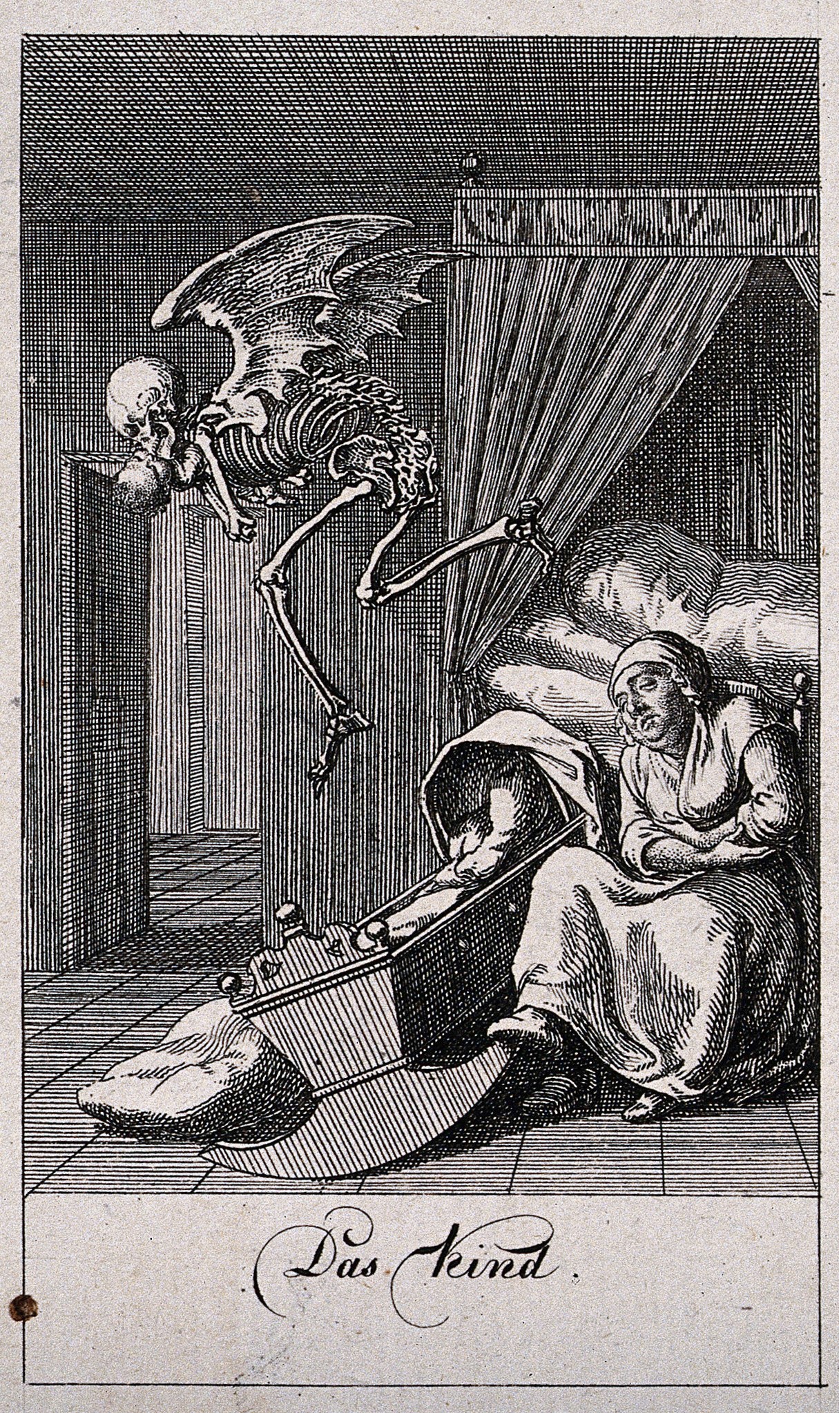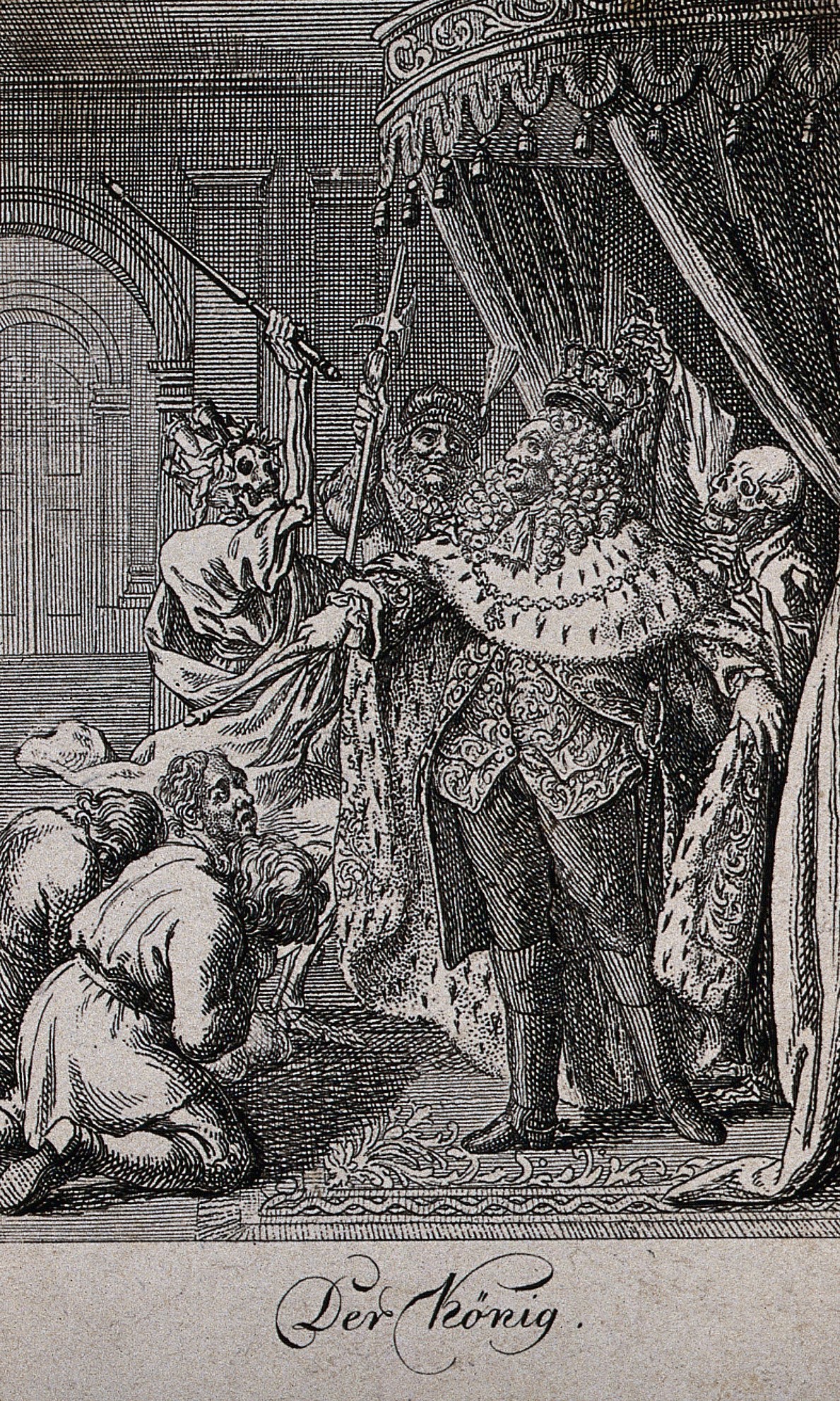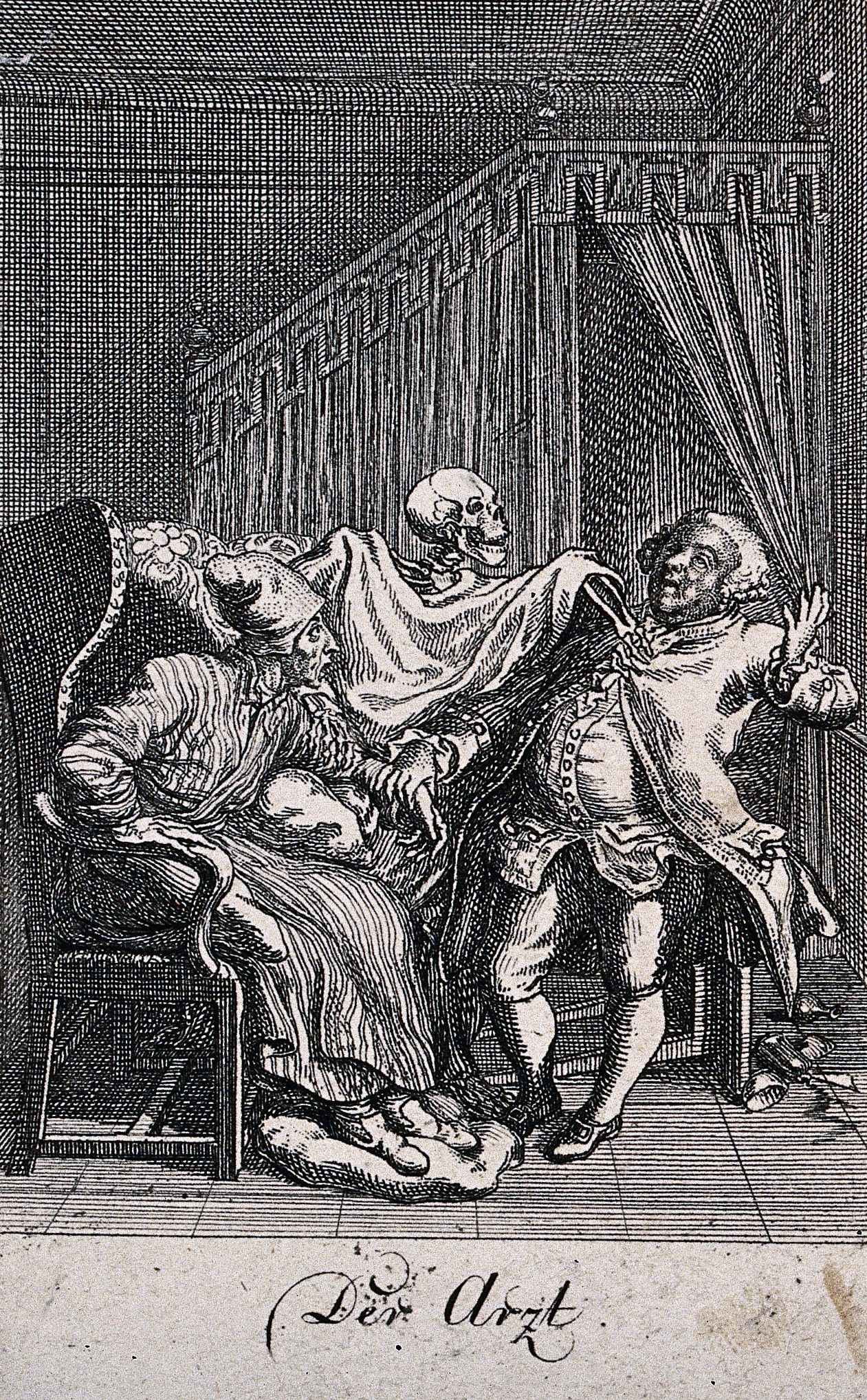Daniel Nikolaus Chodowiecki a réalisé cette danse macabre en 1791. Il s'agit d'une série de douze gravures. Ici encore, la Mort ne danse pas la farandole, mais intervient dans le quotidien des gens. Elle n'est pas jubilatoire, mais excessivement agressive, voire violente. Elle poignarde le pape à l'aide d'une flèche, se prépare à assassiner le roi, s'apprête à transpercer la marchande de poisson avec une faux, s'attaque à une sentinelle. Même le général est traqué par deux Morts, l'une, montée sur un cheval-squelette, le fusillant, et l'autre le menaçant de sa faux. La Mort sait être cruelle; elle s'en prend à un mendiant, enlève un bébé de son berceau alors que sa nourrice s'est assoupie, agresse une mère sous les yeux de ses enfants. Chodowiecki a inclu dans sa danse macabre des scènes classiques, comme celle de la Mort créant la panique à la cour de la reine ou celle de la Mort qui s'interpose entre le médecin et son patient. Ce thème a maintes fois été repris dans des danses macabres ou dans d'autres oeuvres individuelles. L'artiste a aussi ajouté des représentants de classes sociales plutôt inusitées comme la fille de joie ou l'aristocrate se glorifiant de sa lignée. On voit bien ce dernier pointer du doigt les armoiries de sa famille pendant que la Mort se prépare à l'occire. Comme toujours, riches et pauvres se côtoient dans la mort. Références 1 Les images (à l'exception de celle du pape) proviennent de la Wellcome Collection