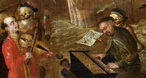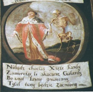 Il existe d'autres oeuvres macabres ailleurs en Pologne. À Zambrów, dans la chapelle funéraire en bois du prêtre Marcin Krajewski, se trouve une danse macabre de 1795. Elle est composée de six peintures polychromes représentant un memento mori (un crâne humain sans sa mâchoire inférieure), un magnat, deux nobles en train de boire, une aristocrate, un soldat et un paysan. Les photos sont de mauvaise qualité. De meilleures seraient bienvenues! À Bierzan, dans l'église en bois Sainte-Hedwige, se trouve une fresque illustrant la Mort et l'avare. On ne connaît pas l'artiste ni la date d'exécution de cette peinture, qui représente la Mort dans une attitude agressive et armée d'une épée. Il est inusité de présenter la Faucheuse avec ce type d'arme, symbole associé à la justice. Elle se sert généralement d'un arc, d'une lance ou d'une faux. D'ailleurs, sur la peinture murale, on peut voir ce dernier instrument gisant sur le sol. De son côté, l'avare semble accepter son sort avec quiétude. À Bochnia, dans la chapelle Sainte-Marie-des-Anges, se trouverait un tableau dont la partie centrale est manquante ou inexistante. L'oeuvre montrerait notamment des ivrognes et un médecin qui se font approcher par la Mort. Références Krol, Anna . 2000. Obrazy smierci w sztuce polskiej XIX i XX wieku. Mrozowski, P. (ed.). 2000. Smierc w kulturze dawnej Polski : Od sredniowiecza do konca XVIII wieku. Zamek Ksazat Pomorskich (ed.). 2002. Taniec smierci: Od Poznego sredniowiecza Do Konca XX Weiku Koutny Aleksandra. 2005. Dancing with Death In Poland.Print Quarterly (vol.22 no.1. P.14-30) Schuchard Jutta. 2011. The Danse Macabre at Bierdzany-Bierdzanzka Smierc (Poland) dans Mixed Metaphors Edited by Sophie Oosterwijk et Stefanie Knoll () P. 311-322. |
